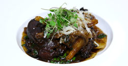 Under the direction of Chefs Bob Brassard and Justin Hoffman, students updated this dish as Mission Fig Braised Pork Cheeks with House-Made Ricotta Ravioli & Sauteed Mushrooms ”In the Kitchen” at the Broadmoor Bistro culinary school.