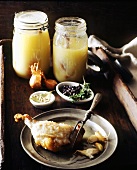 Duck confit is a French dish. To prepare a confit, the meat is rubbed with salt, garlic, and sometimes herbs such as thyme, then covered and refrigerated for up to 36 hours. Salt curing the meat acts as a preservative.