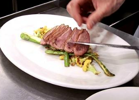 Roasted Duck Breast Duck meat is derived primarily from the breasts and legs of ducks. Although the breast meat is darker than the breast meat of a chicken or a turkey. Being waterfowl, ducks have a layer of heat-insulating subcutaneous fat between the skin and the meat. De-boned duck breast can be grilled like steak, usually leaving the skin and fat on. Internal organs such as heart and kidneys may also be eaten; the liver in particular is often used as a substitute for goose liver in foie gras. Duck is used in a variety of dishes around the world, most of which involve roasting for at least part of the cooking process to aid in crisping the skin. Executive Chef Robert Padilla prepares a side of roasted vegetables topped with a chocolate-cherry sauce for his signature dish. |