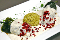 Chiles en Nogada is a dish from authentic Mexican cuisine. It consists of poblano chiles filled with picadillo (a mixture usually containing shredded meat, aromatics, fruits and spices) topped with a walnut-based cream sauce and pomegranate seeds…giving it the three colors of the Mexican flag (green, white & red). The traditional chiles en nogada is from Puebla. It is tied to the independence of this country, since it is said they were prepared for the first time to entertain Agustín de Iturbide on his return from receiving this declaration from Spain. The dish is a source of pride for the inhabitants of the state of Puebla. Executive Chef Diego Rios Torre remains true to this traditional dish with his creation “In the Kitchen” at Frida’s Contemporary Mexican Cuisine. |